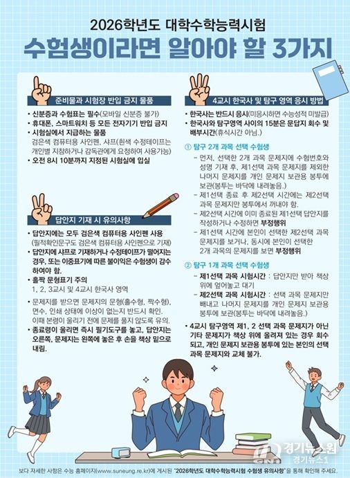 [경기뉴스원/경기뉴스1] | 세종특별자치시교육청은 11월 13일에 실시되는 2026학년도 대학수학능력시험을 수험생들이 안정적으로 치를 수 있도록 ‘수험생 유의사항’을 안내했다.