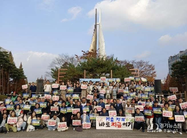 [경기뉴스원/경기뉴스1] | 11월 9일 일산문화광장에서 ‘산황산 골프장 증설 반대 시민문화제가’ 200여명의 시민들이 참석한 가눙데 열렸다. 이번 문화제는 고양시 대표적인 생태 녹지인 산황산 일대 골프장 증설 계획에 반대하는 시민들의 의지를 모르기 위해 마련된 것으로, 지역내 시민사회단체, 종교단체, 정당등이 공동주관했다.