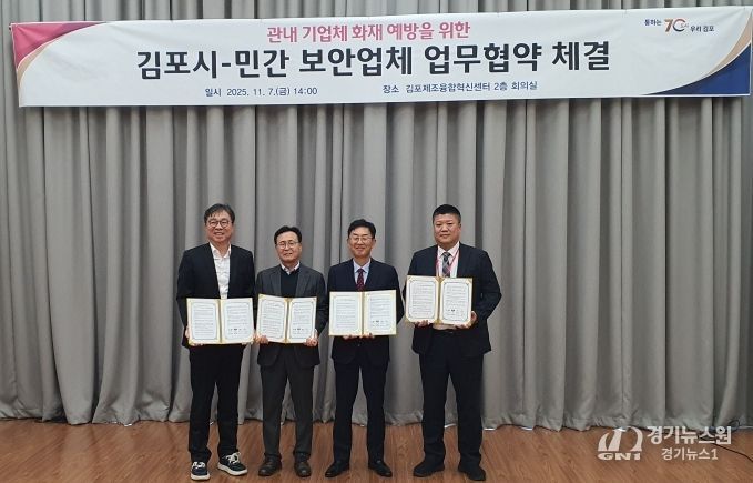 [경기뉴스원/경기뉴스1] | 김포시가 지난 11월 7일 민간 보안업체 3개사와 ‘관내 기업체 화재 예방을 위한 민관 협력 업무협약(MOU)’을 체결했다. 이번 협약식은 최근 소규모 공장과 상가에서 발생한 화재가 초기 대응 지연으로 인해 큰 피해로 이어지는 사례가 늘어남에 따라 민간의 기술력과 공공의 행정력을 결합해 화재로부터 안전한 산업환경을 조성하기 위해 마련됐다.