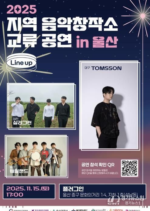 [경기뉴스원/경기뉴스1] | 울산 중구문화의전당에서 운영하는 울산음악창작소가 오는 11월 15일, 11월 16일 오후 5시 성남동 플러그인(문화의거리 14)에서 ‘2025 지역 음악창작소 교류 공연 in 울산’을 개최한다.