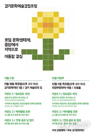 경청포럼은 국민주권정부의 문화정책 변화와 함께 경기도가 준비 중인 기초지자체 기반의 상향식 지역문화 정책의 기본 방향을 가늠해 보기 위해 경기 남부(수원)와 북부(의정부)에서 각각 11월 18일 오후 2시(수원 경기문화재단 경기예술인의 집)와 12월 4일 오후 2시(의정부문화역-이음)에 열린다.