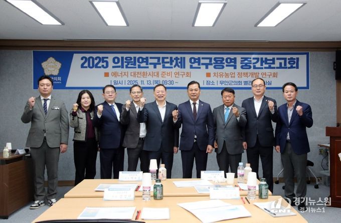 [경기뉴스원/경기뉴스1] | 무안군의회는 11월 13일 군의회 세미나실에서 ‘에너지 기본소득’과 ‘치유농업 활성화’ 연구 등 2개 의원연구단체의 연구용역 중간보고회를 개최했다.