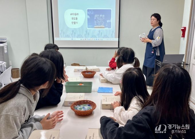 12일 첫 수업에서는 초등학교 저학년 15명을 대상으로 임영미 매듭공예지도사의 지도로 바다유리에 대해 알아보고 바다유리를 활용한‘바다빛 무드등 만들기’체험이 이루어졌다.