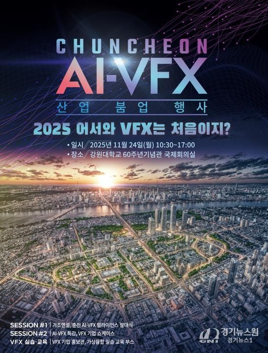 [경기뉴스원/경기뉴스1] | 춘천시는 2025년 11월 24일 강원대학교 60주년 기념관 국제 회의실에서 ‘춘천 AI-VFX 산업붐업행사 – 2025 어서와! VFX는 처음이지?’를 개최한다고 밝혔다.