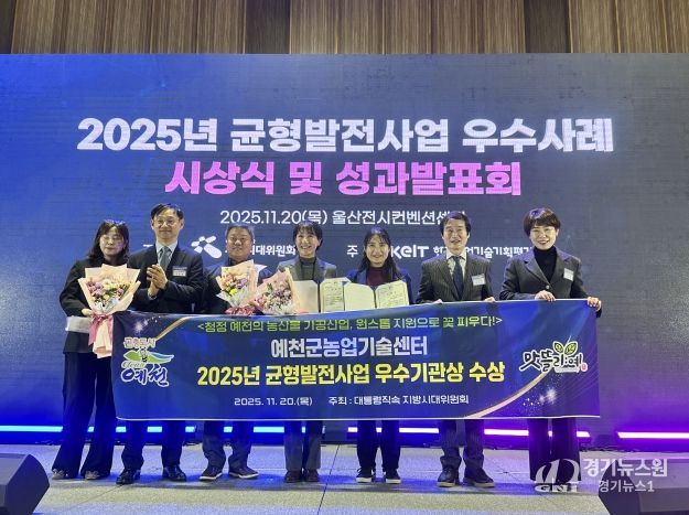 [경기뉴스원/경기뉴스1] | 예천군은 20일, 지방시대위원회가 주최로 울산컨벤션센터에서 열린 ‘2025년 균형발전사업 우수사례 시상식’에서 예천군농산물가공기술지원센터가 지원계정 분야 우수사례로 선정되는 수상의 영광을 안았다고 밝혔다.