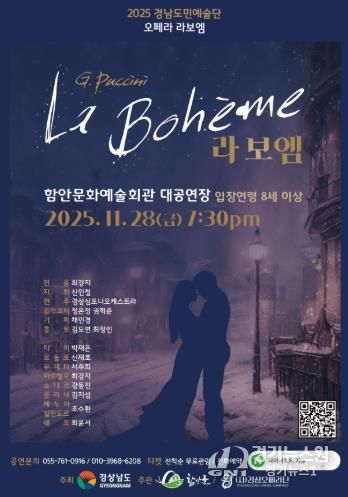 [경기뉴스원/경기뉴스1] | 함안군은 푸치니의 대표작 오페라 〈라 보엠〉을 오는 2025년 11월 28일 오후 7시 30분, 함안문화예술회관 대공연장에서 전석 무료로 선보인다고 밝혔다.