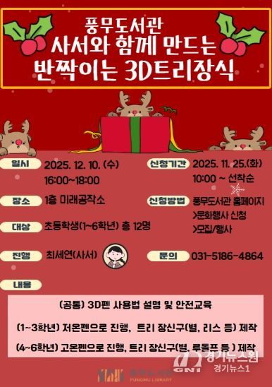 [경기뉴스원/경기뉴스1] | 김포시 풍무도서관에서 초등학생을 대상으로 ‘사서와 함께 만드는 반짝이는 3D트리장식’을 오는 12월 10일 오후 4시부터 6시까지 운영한다.