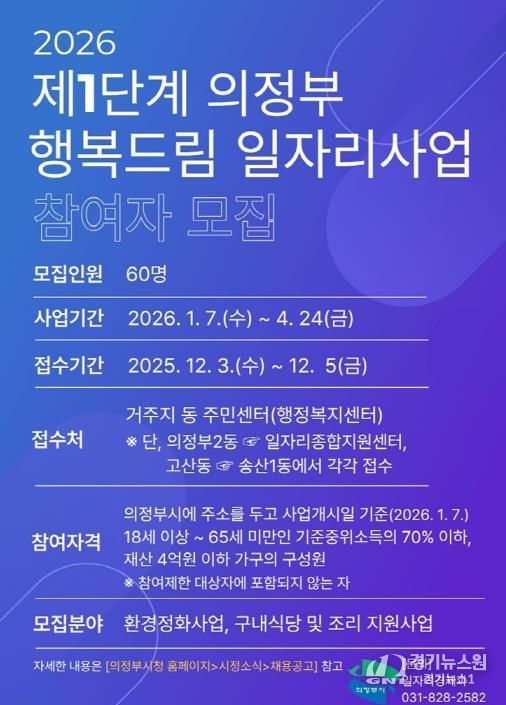 [경기뉴스원/경기뉴스1] | 의정부시는 12월 3일부터 5일까지 ‘2026년 제1단계 의정부 행복드림 일자리사업’ 참여자 60명을 모집한다.