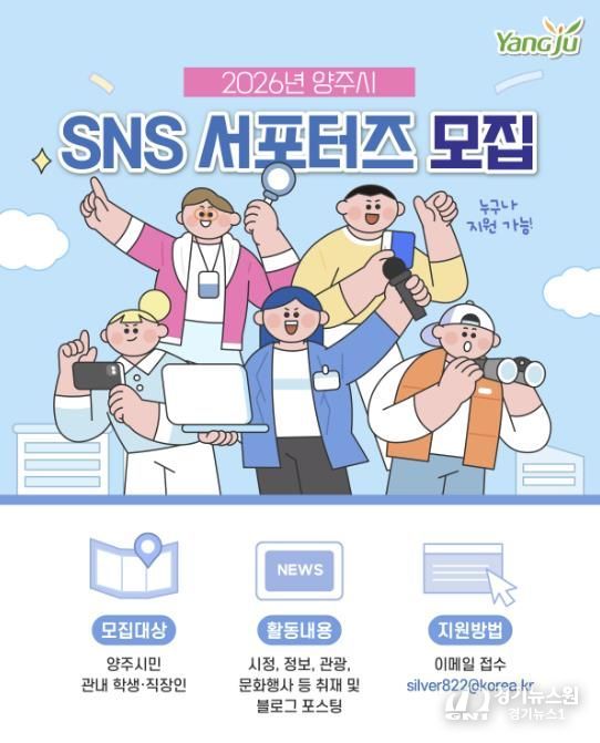 [경기뉴스원/경기뉴스1] | 양주시가 시민과 소통하며 시정 소식과 지역의 숨은 매력을 널리 알릴 '2026년 양주시 SNS 서포터즈'를 오는 12월 1일부터 10일까지 10일간 모집한다.