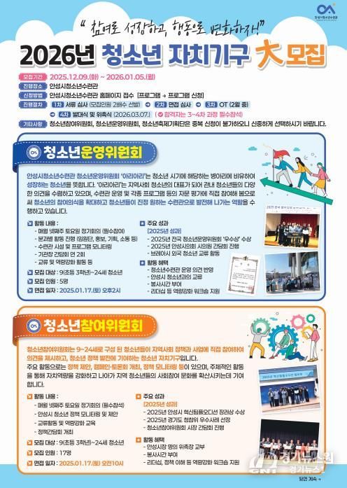 [경기뉴스원/경기뉴스1] | 안성시청소년수련관은 청소년이 지역사회의 구성원으로 참여하고 스스로 기획·운영하는 활동을 지원하기 위해 ‘2026년 청소년 자치기구’ 신규 청소년을 모집한다.