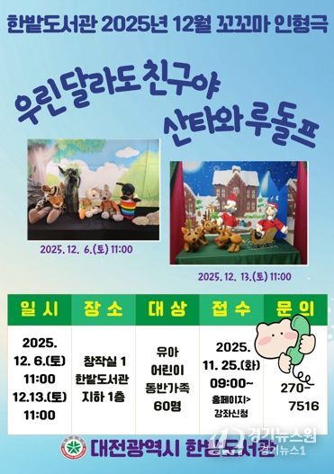 [경기뉴스원/경기뉴스1] | 한밭도서관은 지역 어린이들에게 따뜻한 감성과 사회적 가치를 전하기 위해 두 가지 인형극 ‘우린 달라도 친구야’, ‘산타와 루돌프’를 공연한다.