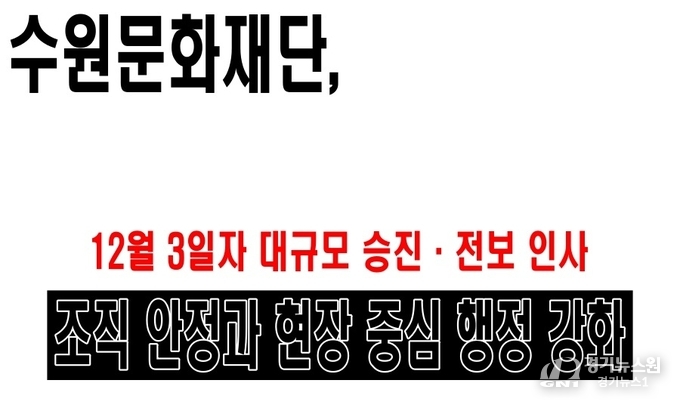 【수원=경기뉴스원/경기뉴스1】 | 수원문화재단이 12월 3일자로 승진 5명, 전보 22명 등 총 27명에 대한 인사를 단행하며 조직 운영 체계를 대폭 재정비했다. 재단은 이번 인사를 “조직 역량 강화와 현장 중심 행정의 실효성 제고를 위한 전략적 조치”로 단행했다.