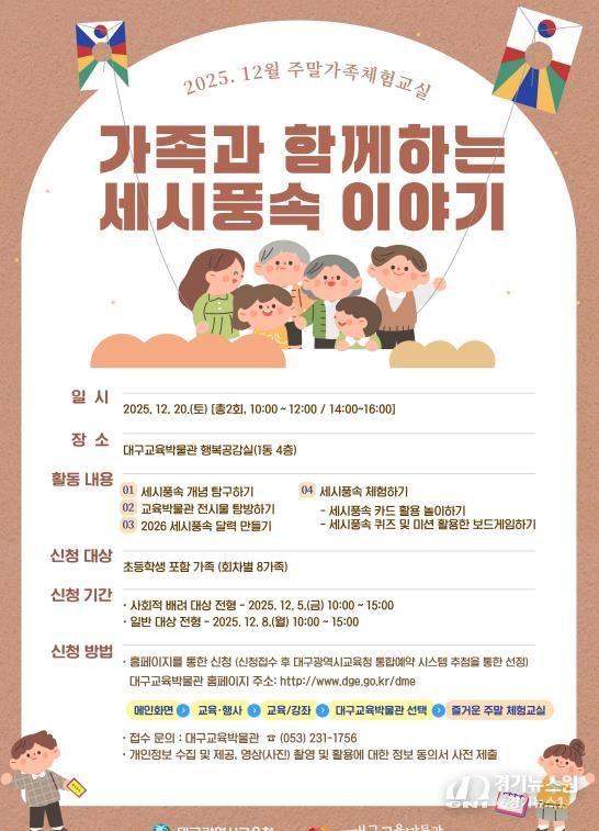 [경기뉴스원/경기뉴스1] | 대구교육박물관은 오는 12월 20일 오전 10시와 오후 2시, 박물관 행복공감실에서 총 2회에 걸쳐 운영되는 12월 주말가족체험교실 ‘가족과 함께 하는 세시풍속 이야기’에 참여할 초등학생을 포함한 16가족(회차별 8가족)을 모집한다.
