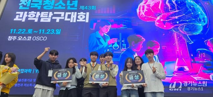 [경기뉴스원/경기뉴스1] | 충청북도교육청 직속기관 자연과학교육원은 지난 11월 22일과 23일 양 일간, 청주 오스코(OSCO)에서 개최된 2025년 제43회 청소년과학탐구대회에서 충북 대표로 출전한 6개 팀이 금상 2개, 은상 3개, 동상 1개를 획득하며 전원 입상하는 쾌거를 이뤘다고 밝혔다.