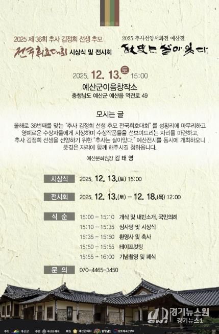 [경기뉴스원/경기뉴스1] | 예산문화원은 지난 10월 11일 개최된 ‘제36회 추사김정희선생 추모 전국휘호대회’ 시상식을 오는 12월 13일 예산군 이음창작소에서 진행한다고 밝혔다.