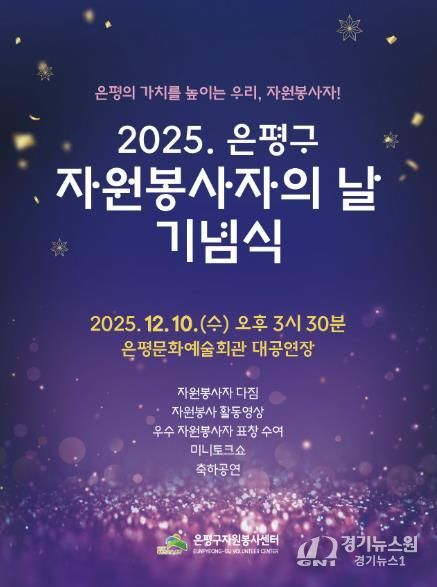 [경기뉴스원/경기뉴스1] | 서울 은평구는 오는 10일 은평문화예술회관 대공연장에서 ‘2025 자원봉사자의 날 기념식’을 개최한다고 밝혔다.