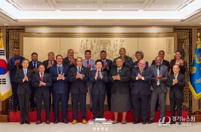 [경기뉴스원/경기뉴스1] | 이재명 대통령은 12월 10일 오전, 대통령실에서 제6차 한-태평양도서국 외교장관회의 참석을 위해 방한한 태평양도서국 외교장관 일행을 접견했다.