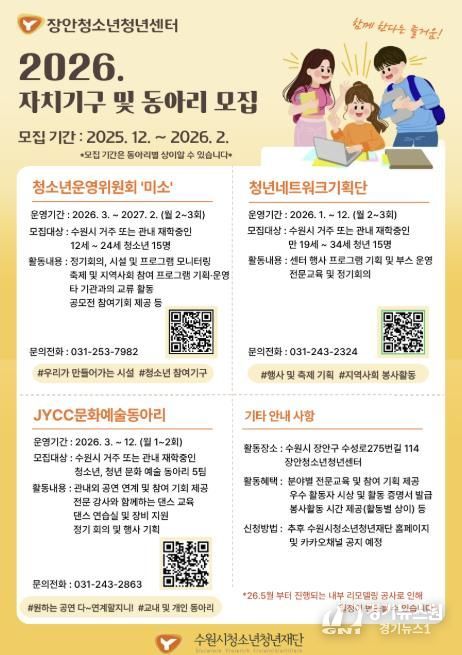 [경기뉴스원/경기뉴스1] | 수원시청소년청년재단 장안청소년청년센터는 2025년 12월 16일부터 청소년 수련시설 및 지역사회의 변화를 이끌어갈 청소년과 청년 지원자를 모집한다.
