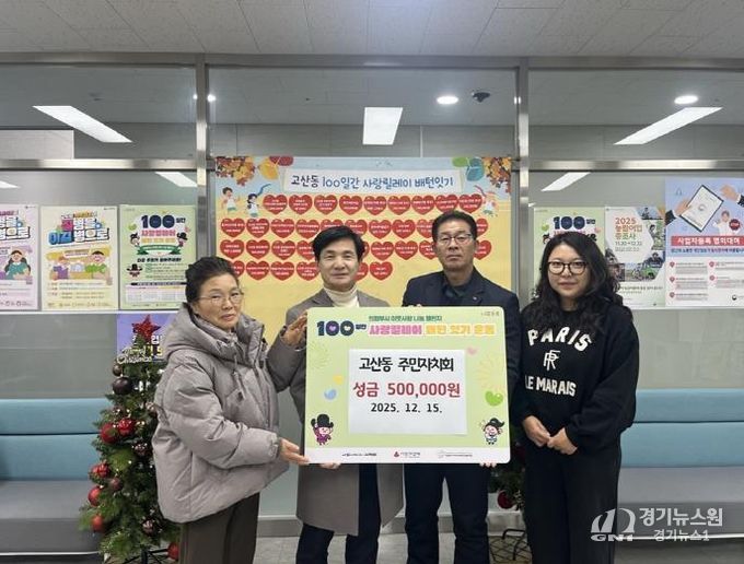 [경기뉴스원/경기뉴스1] | 의정부시 고산동주민센터는 12월 15일 고산동 주민자치회가 저소득층을 위한 성금 50만 원을 전달하며 ‘100일간 사랑릴레이 배턴 잇기’에 참여했다고 밝혔다.