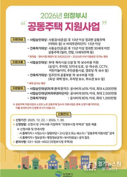 [경기뉴스원/경기뉴스1] | 의정부시는 노후 공동주택의 관리비용 부담 완화와 주거환경 개선을 위해 내년 1월 30일까지 ‘2026년 공동주택 지원사업’ 신청을 받는다.