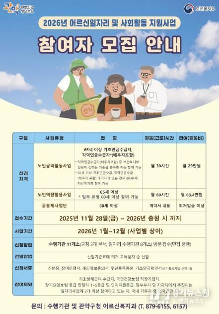 [경기뉴스원/경기뉴스1] | 관악구가 초고령시대 진입을 앞두고 어르신들의 사회참여 증진과 노후 소득 보장을 위해 ‘2026년 노인일자리 및 사회활동 지원사업’을 대폭 확대 추진한다.