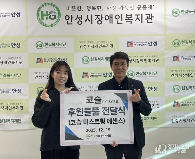 [경기뉴스원/경기뉴스1] | 사회복지법인 한길복지재단에서 수탁하고 있는 안성시장애인복지관은 지난 12월 16일, 코스메틱 브랜드 코슬(COSEUL)로부터 미스트형 에센스 50개(약 2,900,000원 상당)를 기부받았다고 밝혔다.