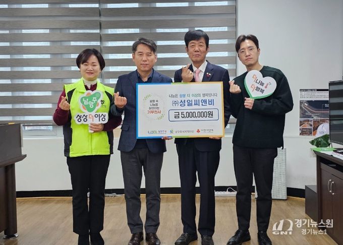 [경기뉴스원/경기뉴스1] | 남양주시는 지난 23일 오남읍사무소에서 ㈜성일씨앤비가 연말을 맞아 오남읍 취약계층 지원을 위해 후원금 500만 원을 남양주시복지재단에 기부했다고 밝혔다.