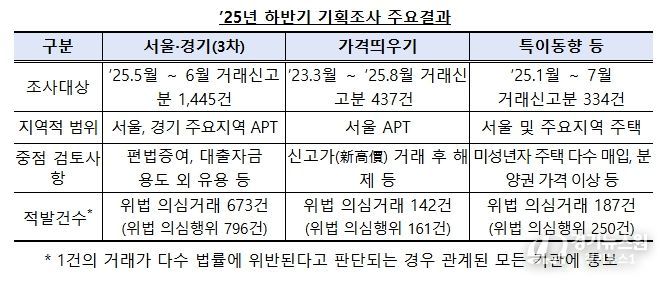 이번 기획조사는▴서울·경기 주택 이상거래(’25.5월~6월 거래신고분),▴부동산 실거래가 띄우기(’23.3월~’25.8월 거래신고분), ▴특이동향 등(’25.1월~7월 거래신고분) 3가지 분야에 대해 실시됐다.