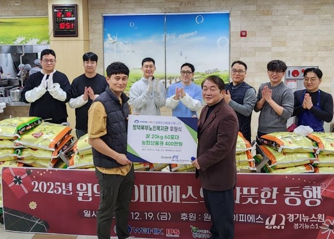 [경기뉴스원/경기뉴스1] | 원익IPS는 12월 19일, 평택북부노인복지관에 쌀 20kg 60포와 온누리 상품권 4,000,000원을 기부하며 따뜻한 나눔을 실천했다. 이번 전달식은 지역사회 나눔 문화 확산에 앞장서 온 원익IPS의 꾸준한 사회공헌 활동의 일환으로, 지역 내 어르신들에게 실질적인 도움을 주기 위한 의미있는 기부로 진행됐다.