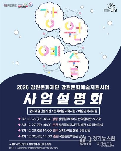 [경기뉴스원/경기뉴스1] | 강원문화재단은 2026년 강원문화예술지원사업의 주요 내용과 변경 사항을 도내 예술인에게 종합적으로 안내하기 위해 ‘2026년 강원문화예술지원사업 통합 설명회’를 개최한다고 밝혔다.