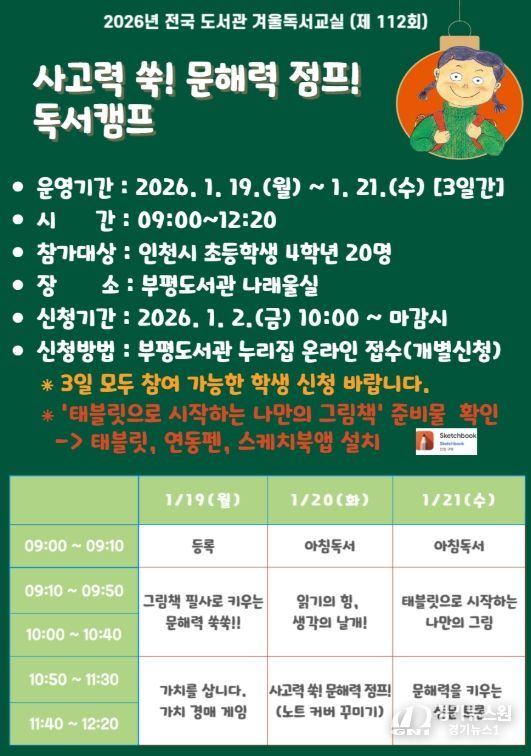 [경기뉴스원/경기뉴스1] | 인천광역시교육청부평도서관은 2026년 1월 19일부터 21일까지 초등학교 4학년 20명을 대상으로 겨울독서교실 ‘사고력 쑥! 문해력 점프! 독서캠프’를 운영한다.