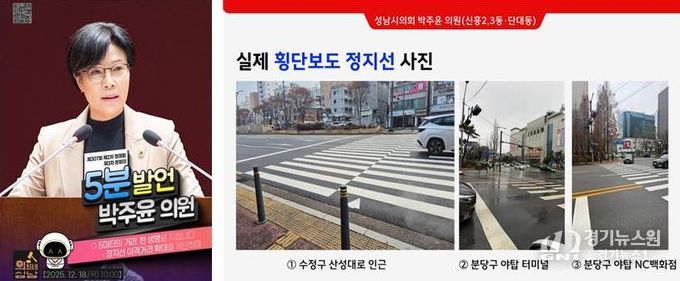 [경기뉴스원/경기뉴스1] | 성남시의회 박주윤 의원(국민의힘, 신흥2·3동·단대동)은 12월 18일 열린 제307회 성남시의회 제3차 본회의 5분 발언에서 보행자의 생명과 직결된 ‘횡단보도 정지선 이격거리 확대 설치’의 시급성을 강조하며, 성남시의 적극적인 개선책 마련을 촉구했다.