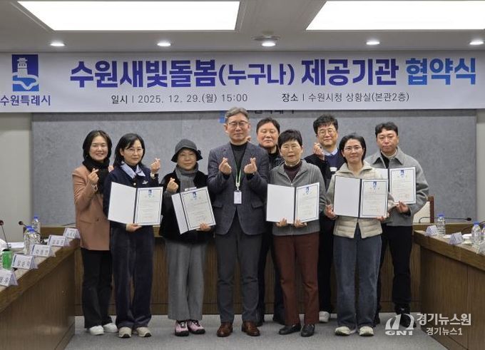[경기뉴스원/경기뉴스1] | 수원특례시이 29일 시청 상황실에서 ‘수원새빛돌봄(누구나) 서비스 제공기관 재협약 협약식’을 열고, 서비스 제공기관들과 재협약을 체결했다.