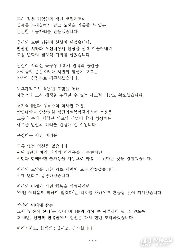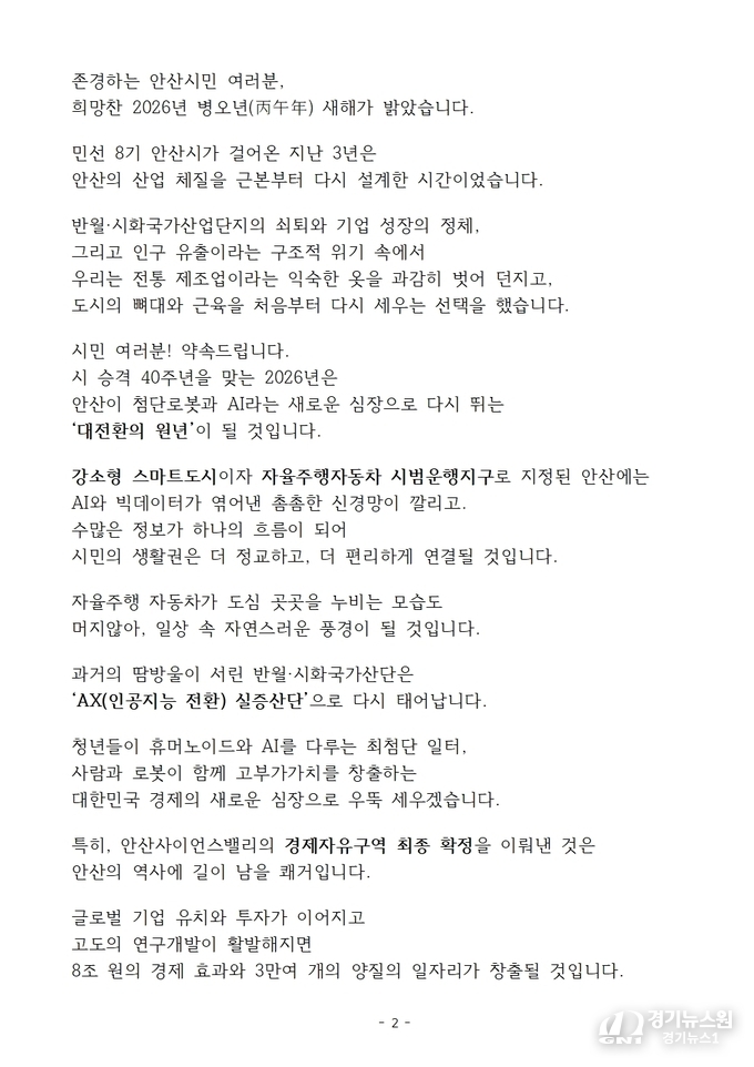 안산시는 “2026년은 전환의 한복판에서 안산이 다시 도약하는 해가 될 것”이라며 “어디에 살든 ‘안산에 산다’는 사실이 시민의 자부심이 되도록 흔들림 없이 나아가겠다”고 밝혔다.