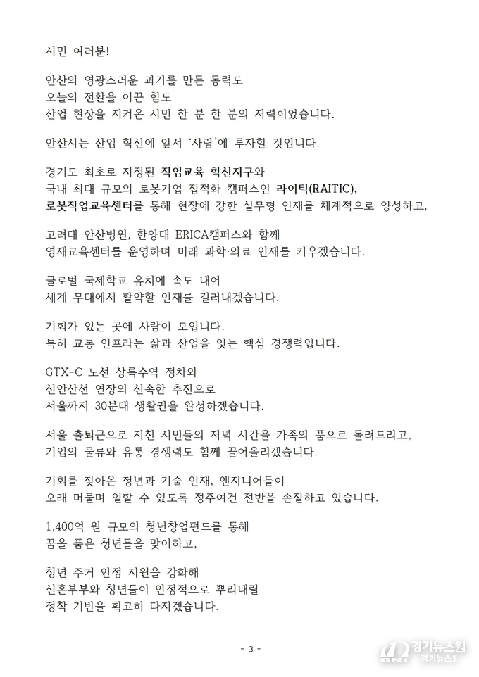 교통 인프라 확충을 통한 생활권 개선도 핵심 과제로 제시됐다. GTX-C 노선 상록수역 정차와 신안산선 연장을 통해 서울 30분대 접근성을 확보하고, 시민의 삶의 질과 기업 경쟁력을 동시에 높이겠다는 구상이다.