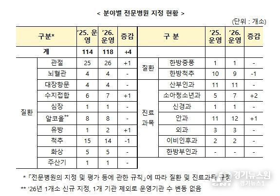 제5기 3차년도 전문병원 지정에 따라, 2025년 114개에서 2026년에는 118개 전문병원을 지정·운영하게 된다.