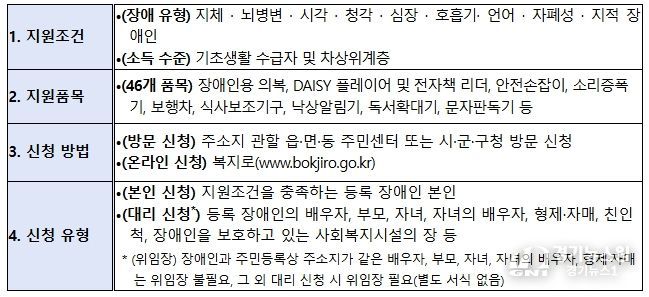 장애인 보조기기 교부 사업은 기초생활 수급자 및 차상위계층에 해당하는 등록 장애인을 대상으로 일상 생활의 편의를 돕기 위한 보조기기를 무료로 지원하는 사업이다.