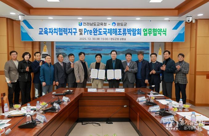 [경기뉴스원/경기뉴스1] | 완도군은 지난해 12월 30일 전라남도교육청과 교육자치협력지구의 원활한 사업 운영과 2026 Pre완도국제해조류박람회 협력 체계 구축을 위한 업무 협약을 체결했다.