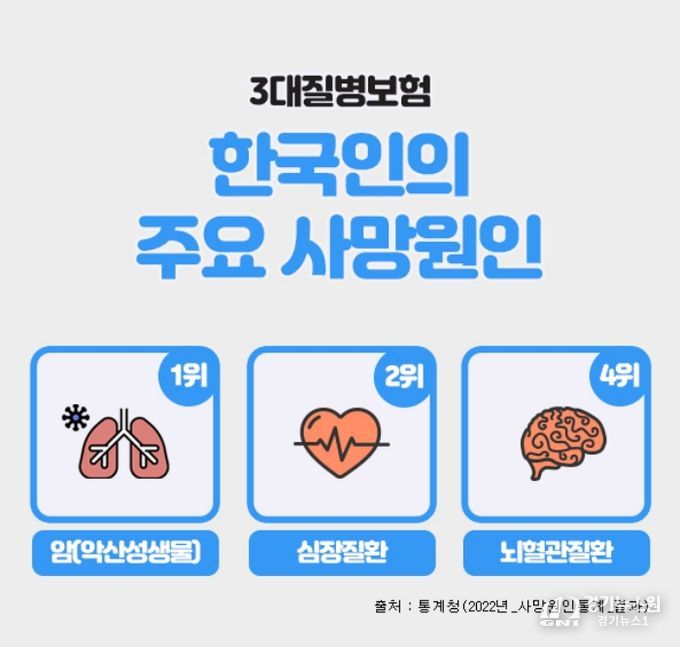 [경기뉴스원/경기뉴스1] | 3대질병으로 일컬어지는 암, 뇌혈관질환, 심혈관질환은 한국인의 주요 사망원인에서 상위를 차지하고 있으며, 이에 대한 진단비를 집중적으로 보장해 주는 보험상품을 3대질병진단비 보험이라 할 수 있다.