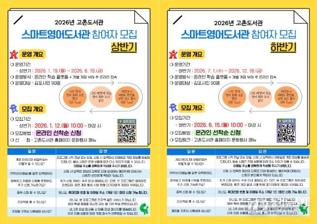 [경기뉴스원/경기뉴스1] | 김포시 고촌도서관이 2026년 1월 19일부터 12월 18일까지 ‘2026년 스마트영어도서관’을 운영한다.