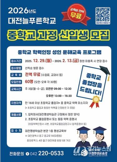 [경기뉴스원/경기뉴스1] | 대전평생학습관은 2026년 2월 13일까지 2026년 대전늘푸른학교 중학교 학력인정 과정 신입생을 모집한다고 밝혔다.