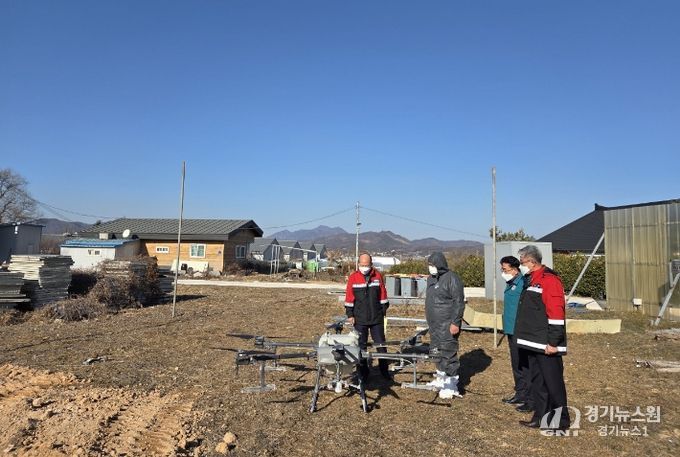 [경기뉴스원/경기뉴스1] | 충주시는 7일 고병원성 조류인플루엔자 방생농장 일대에서 드론을 이용해 소독약을 살포하는 방제를 실시했다.