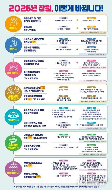 한편, '2026년 달라지는 시책' 책자는 각 읍·면·동 행정복지센터 민원대에 비치될 예정이며, 전자책(e-book) 형태로도 발간돼 창원시 홈페이지(시정소식→주요시정→2026년 달라지는 시책)에서 세부내용을 확인할 수 있다.