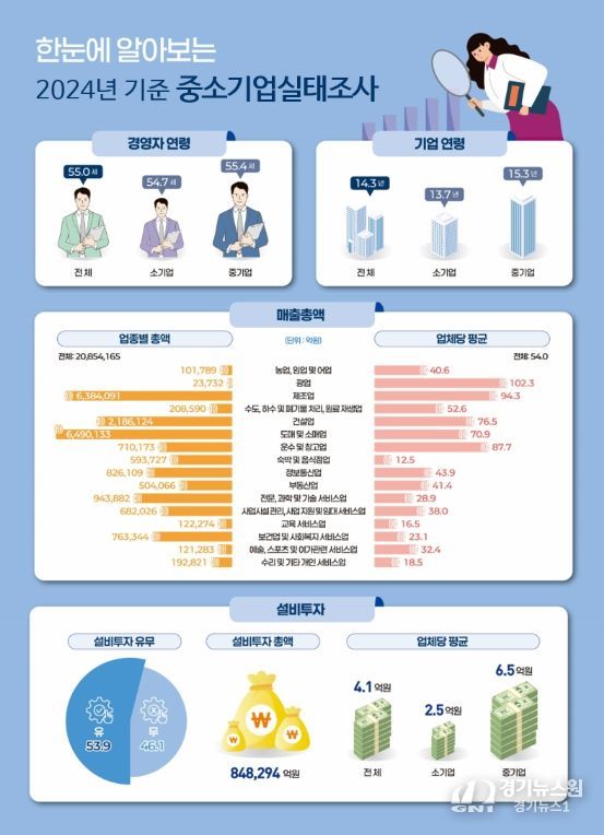 [경기뉴스원/경기뉴스1] | 중소벤처기업부는 '2024년 기준 중소기업실태조사' 결과를 발표했다. 중소기업실태조사는 중소기업의 경영 현황을 비롯한 실태 전반을 파악하여 중소기업 지원 정책 수립을 위한 기초자료로 활용하기 위해 매년 시행되고 있다.