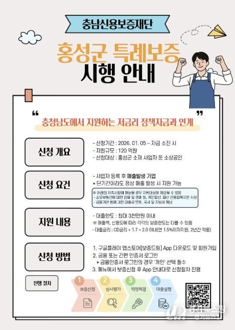[경기뉴스원/경기뉴스1] | 홍성군은 경기 둔화와 고금리·고물가 상황이 지속됨에 따라 자금 조달과 경영 운영에 어려움을 겪고 있는 관내 소상공인의 금융 부담을 완화하고자 ‘2026년 소상공인 특례보증 지원사업’을 시행한다고 밝혔다.
