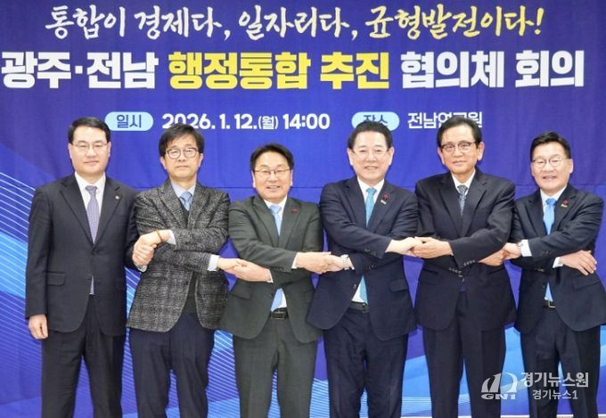 [경기뉴스원/경기뉴스1] | 광주광역시와 전라남도는 12일 나주 전남연구원에서 제1호 광역통합 지방정부 출범을 향한 민관합동 실무기구인 ‘광주·전남 행정통합 추진협의체’ 발족과 함께 첫 회의를 열어 광주전남 행정통합 특별법과 시도민 의견수렴, 공론화 방안 등을 논의했다.