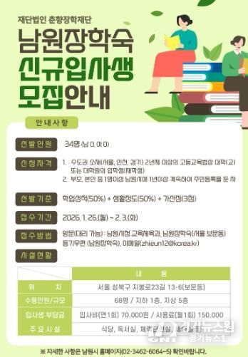 [경기뉴스원/경기뉴스1] | 재단법인 춘향장학재단에서 운영하는 남원장학숙이 2026년도 신규입사생을 모집한다.