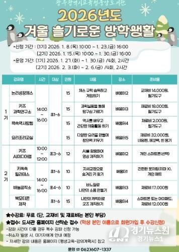 [경기뉴스원/경기뉴스1] | 광주시교육청중앙도서관은 겨울방학을 맞아 오는 27일부터 2월 6일까지 초등학생을 대상으로 ‘겨울 슬기로운 방학생활’을 운영한다.