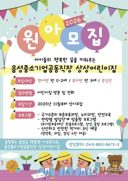 [경기뉴스원/경기뉴스1] | 음성군은 중소기업 근로자의 보육환경 개선과 일·가정 양립 문화 확산을 위해 운영 중인 중소기업 공동직장어린이집 ‘상상어린이집’의 원아를 모집한다.