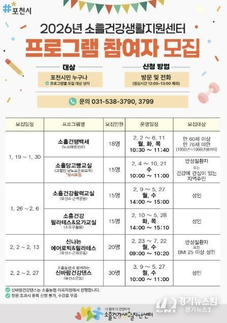 [경기뉴스원/경기뉴스1] | 포천시 소흘건강생활지원센터는 시민들의 건강 증진과 활기찬 일상 지원을 위해 오는 19일부터 ‘2026년 상반기 건강증진 프로그램’ 참여자를 모집한다.